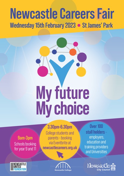 The My Future: My Choice careers fair will take place on Wednesday 15th February 2023 at St James' Park Stadium. Year 9, Year 11, sixth formers, college students and their parents are all invited to attend. The event will feature stall holders and speakers covering general and sector specific options. This will include the city’s colleges and universities, and employers from a variety of sectors including green renewable, public services, hospitality, engineering and more.