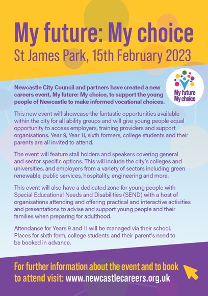 Newcastle City Council and partners have created a new careers event, "My Future: My Choice", to support the young people of Newcastle to make informed vocational choices. This new event will showcase the fantastic opportunities available within the city for all ability groups and will give young people equal opportunity to access employers, training providers and support organisations.