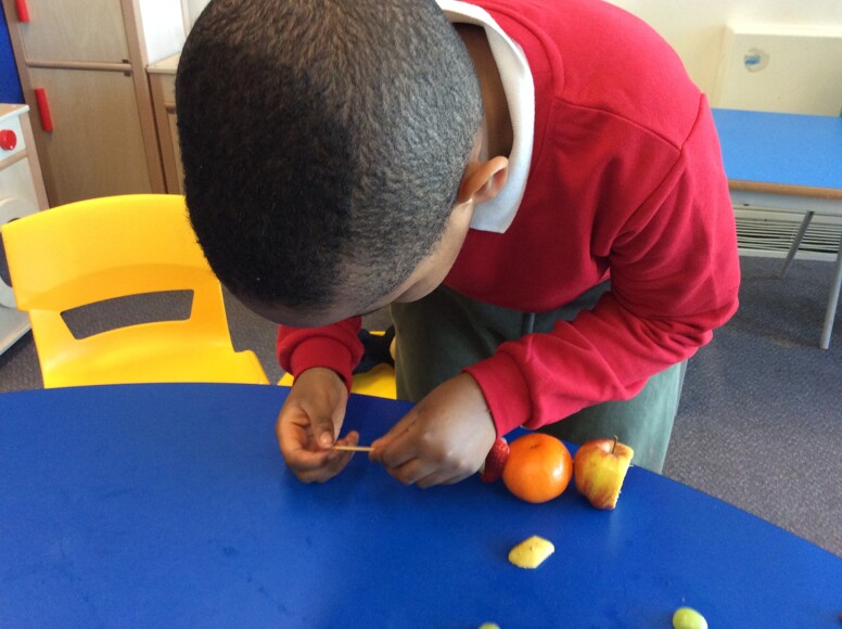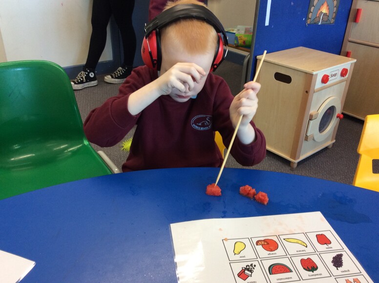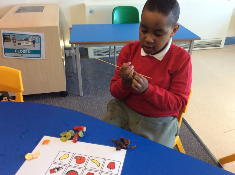 Last week Class 1 were busy making fruit kebabs. We were all fantastic at using our communication boards to request the fruit we wanted. We then demonstrated some fantastic perseverance skills, as we threaded the fruit onto the kebab stick – this was tricky work! We were going to save our kebabs for snack time but they looked so delicious we ended up eating them straight away. Strawberries were definitely the most popular fruit!