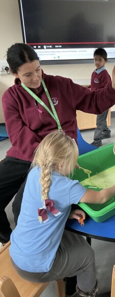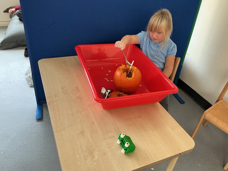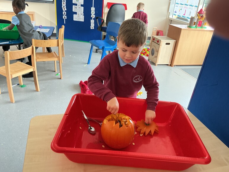 Kenton Bar Class A has had lots of fun exploring Autumn-themed tuff trays. Their favourite was the tray of gloop, as the pupils loved picking it up and letting it run through their fingers. They also enjoyed scooping all of the insides out of the pumpkin.
