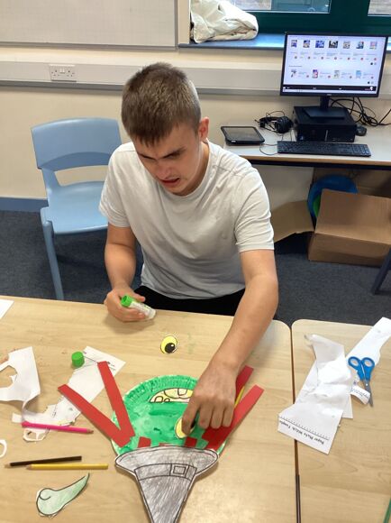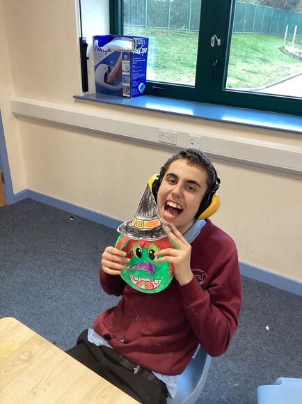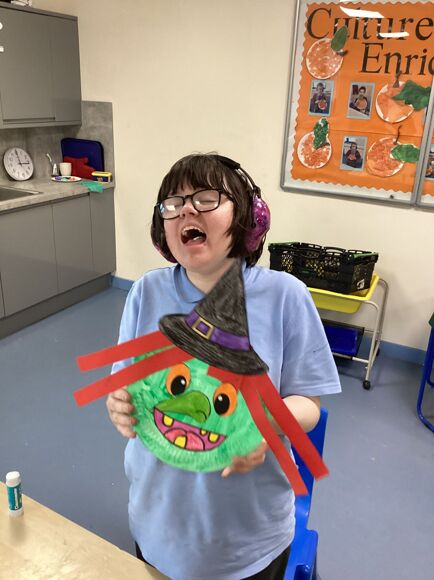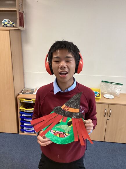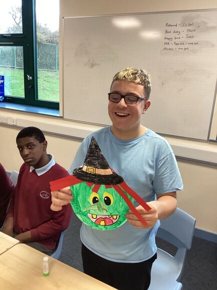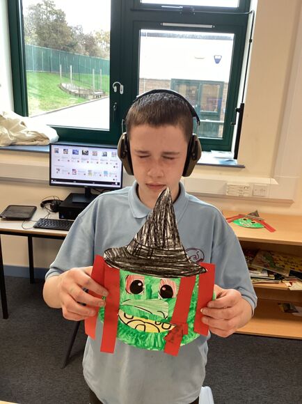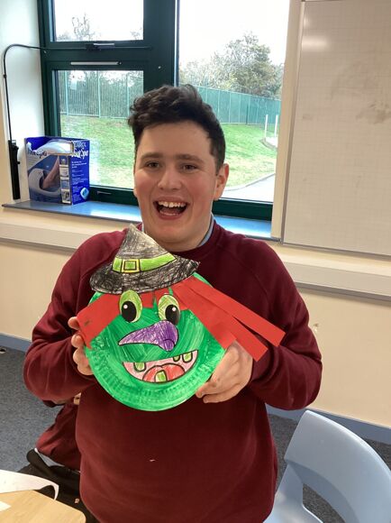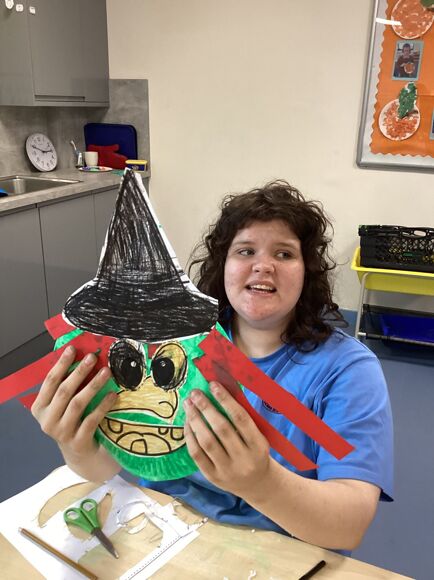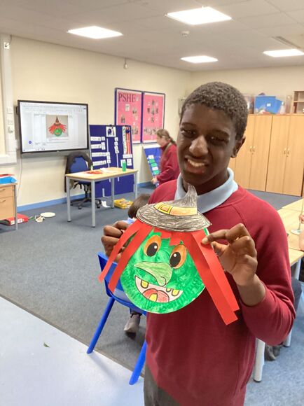 During Expressive Art, Class 28 made witch faces. The pupils painted the face first and then added a cut-out strip of paper for the hair, and then coloured and cut out eyes, nose, mouth, and a hat to stitch on.