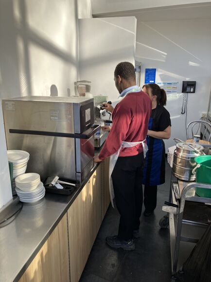 "Michee did nothing but smile when I arrived to see him. Julie said he had been working very hard this morning and felt like she had asked him to do too much because he had been such an amazing help. He packaged and labelled the all the fruit and cheese scones and out these on the counter, refilled the condiments, refilled the fridge and crisps, and cleared and cleaned the tables. In between this he was serving the customers. Michee made me and my colleague a latte and a cup of tea – Julie is currently training him on the coffee machine.